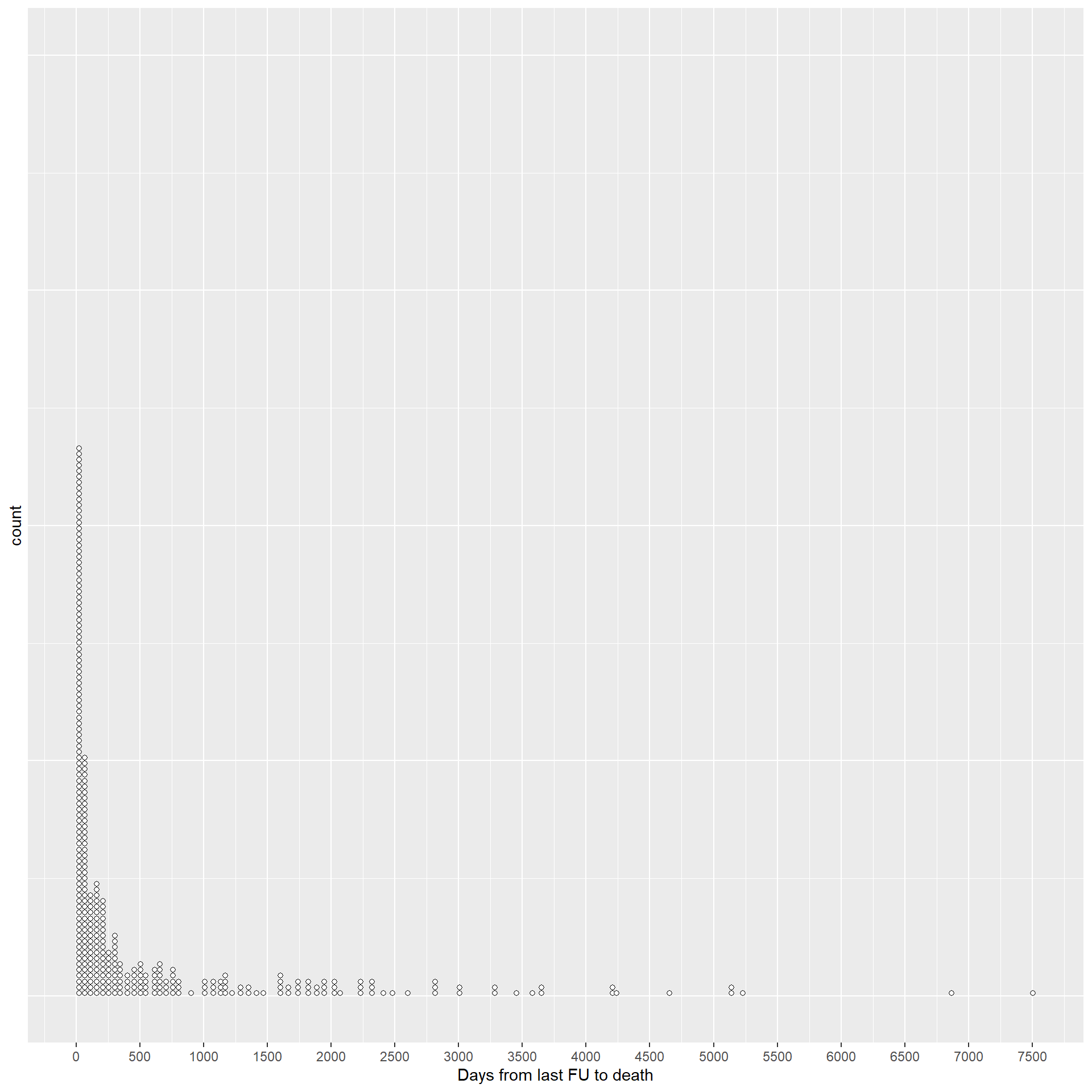 This dotplot shows the distribution of the values of the difference in days between the day of death and the day of last follow-up, for the patients who had a date of last follow-up before the date of death.